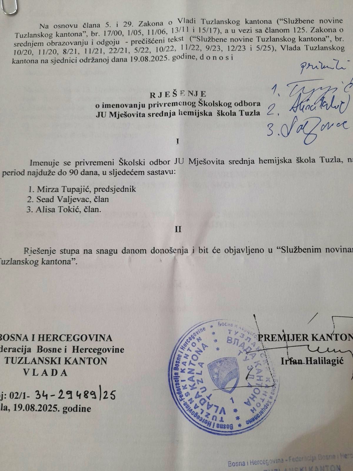 Školski odbor JU Mješovite srednje hemijske škole Tuzla obavlja poslove utvrđene Zakonom o srednjem obrazovanju i Pravilima škole a način rada Školskog odbora bliže je određen Poslovnikom o radu Školskog odbora JU Mješovite srednje hemijske škole. Pored toga što odlučuje o veoma važnim pitanjima za rad ustanove, Školski odbor će ostvarivati funkciju upravljanja koji će u saradnji sa direktorom škole iznalaziti rješenja od ključnog značaja za rad škole.